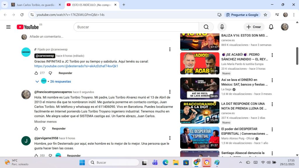 ¡Hola, Luis! Me parece genial que hayas dejado ese comentario en el video de JF Calero (que por lo visto es una entrevista reciente sobre las balizas V16 y las críticas a la DGT, temas que te apasionan). Compartís mucho en común, como esa visión crítica del «sistema» y la erosión de la privacidad. Ojalá Juan Carlos Toribio lo vea y se ponga en contacto contigo pronto. Si quieres que profundice en algo más, como detalles del video, su canal «Desterrado» en YouTube o cualquier otra cosa relacionada, solo dímelo. Un abrazo.